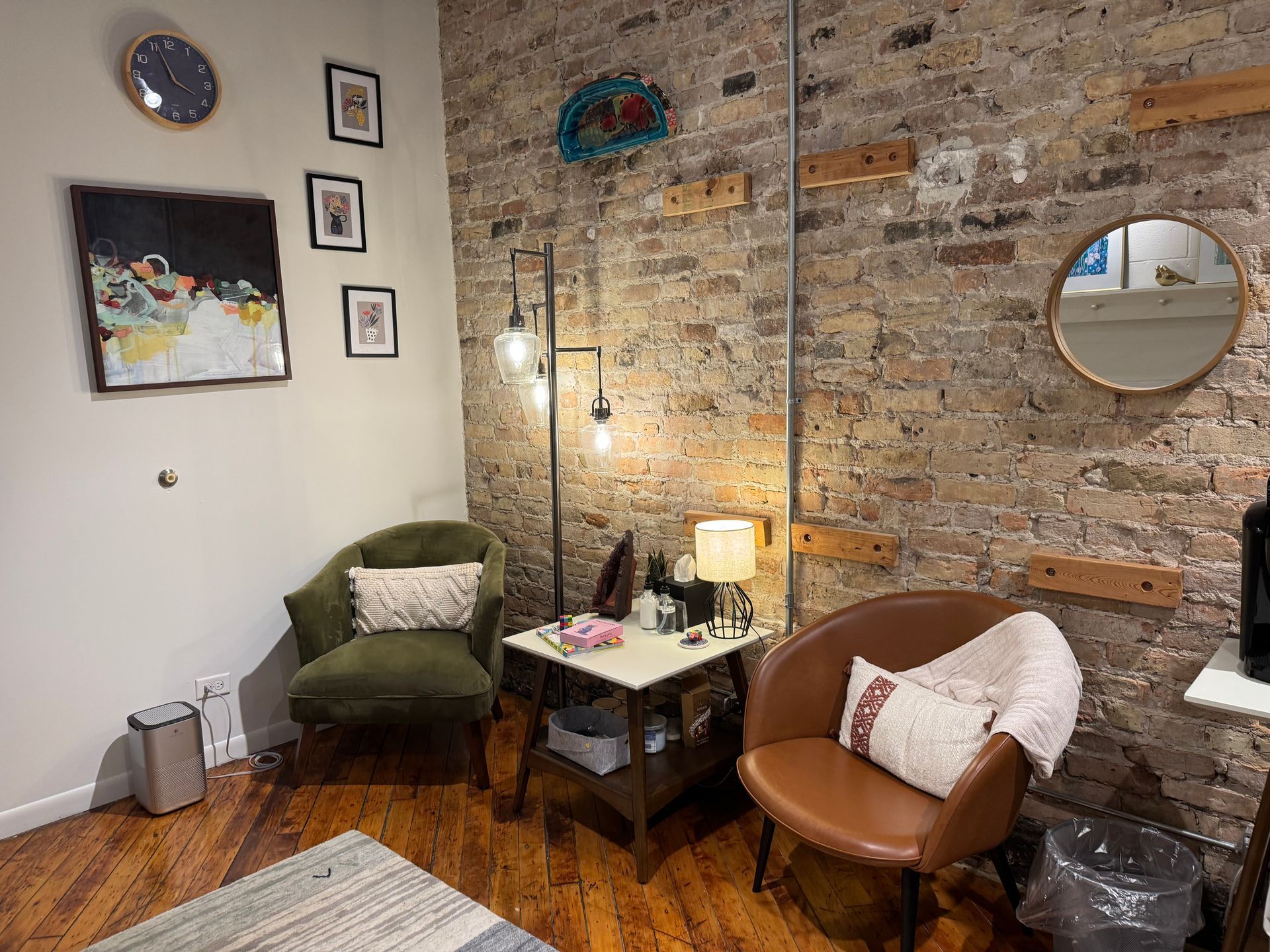 For in-person sessions I meet with clients at my office (photos below) in the west loop, located right by the Oglivie Metra stop and the Clinton Green/Pink el line stop. My office is a spacious loft ideal for art-making, and also very comfortable for talk therapy. Clients interested in exploring Art Therapy have access to using a wide variety of art materials, kept fully stocked in the office/studio space.