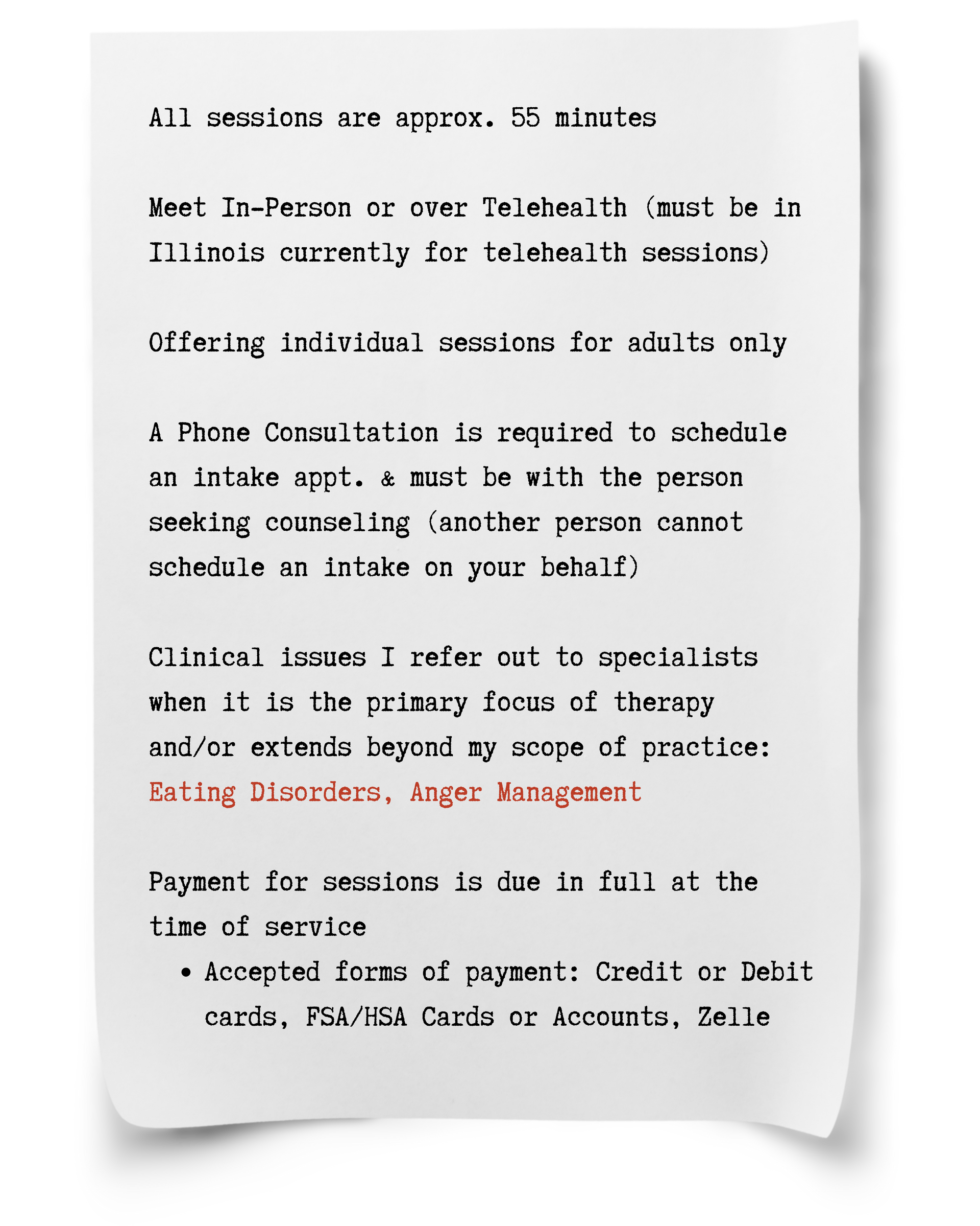 Masking is currently optional, with this policy subject to change based upon ongoing assessments of public health risks. I am more than happy to wear a mask in session when requested by the client. I also run multiple air purifiers in the office simultaneously whenever clients are present. Thus far, this has been successful in preventing contagious illness (including COVID-19) from spreading among clients and/or myself within the office space.